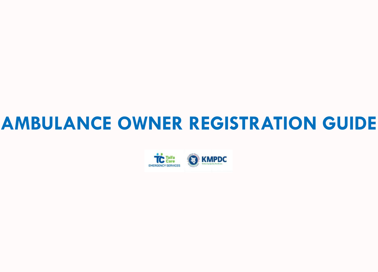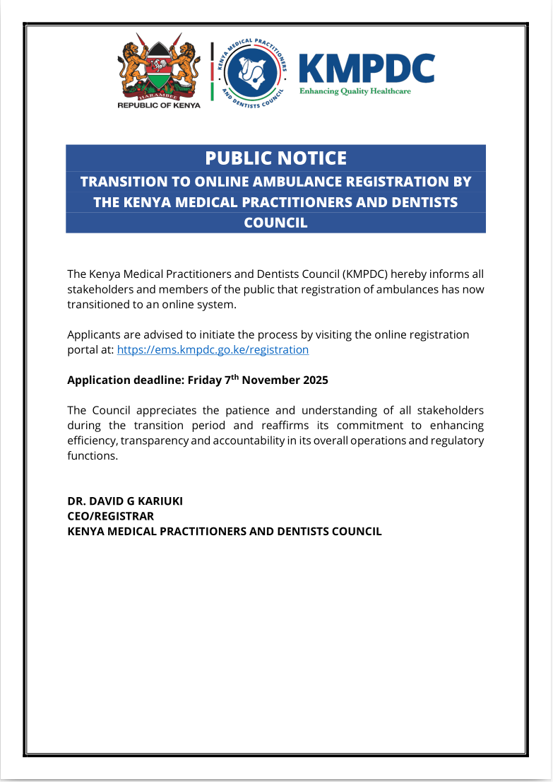 TRANSITION TO ONLINE AMBULANCE REGISTRATION BY THE KENYA MEDICAL PRACTITIONERS AND DENTISTS COUNCIL The Kenya Medical Practitioners and Dentists Council (KMPDC) hereby informs all stakeholders and members of the public that registration of ambulances has now transitioned to an online system. Applicants are advised to initiate the process by visiting the online registration portal at: https://ems.kmpdc.go.ke/registration Application deadline: Friday 7th November 2025. To view and download a guide on how to register as an ambulance owner on the portal head up to the downloads page under the resources section then click on the drop down titled EMS.